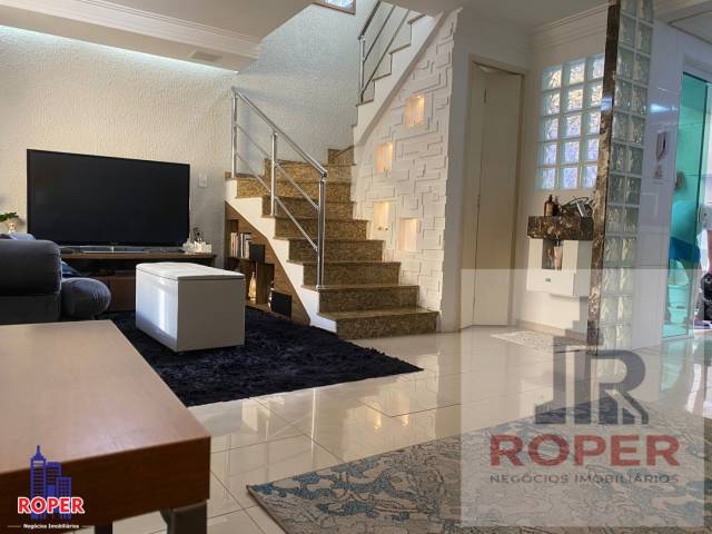 Sobrado em condomínio horizontal fechado de seis unidades, composto de sala para dois ambientes, lavabo, cozinha americana, lavanderia/quintal com churrasqueira, duas suítes, um quarto (de vestir), lavabo, varanda, garagem coberta com 3 vagas, pisos das salas e cozinha em porcelanato, pisos do quarto e suítes em carpete de madeira. Ficarão no imóvel além dos armários embutidos, cortinas, lustres e chuveiros, na cozinha americana continuarão, a mesa, o purificador de ar, o fogão cooktop, o forno elétrico, o microondas e a geladeira frost free. condomínio com porteiro eletrônico, cerca eletrificada e câmeras de segurança (controladas pela internet). Documentação ok, aceita financiamento